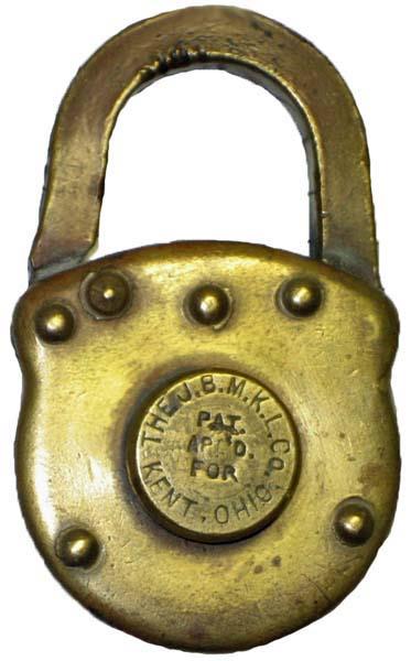 "J. B. M. K. L. Co. KENT. OHIO. PAT. APL'D. FOR". Brass body. Brass shackle. Bra