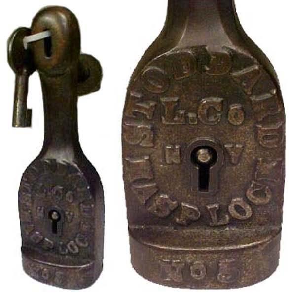 This padlock was manufactured by L. Co. NY. | Classification: 70/9