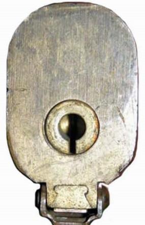"U.S. CUSTOMS". 3 1/8" high x 1 3/4" wide x 1 1/4" deep. Brass body. Brass shack